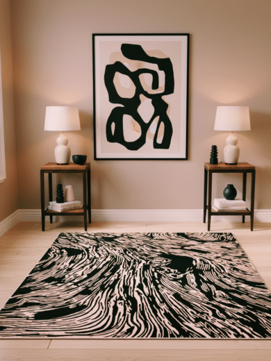 ₹15,300 – ₹97,500Price range: ₹15,300 through ₹97,500FLOWLINE ABSTRACT HAND TUFTED RUG - PEACH/BLACK